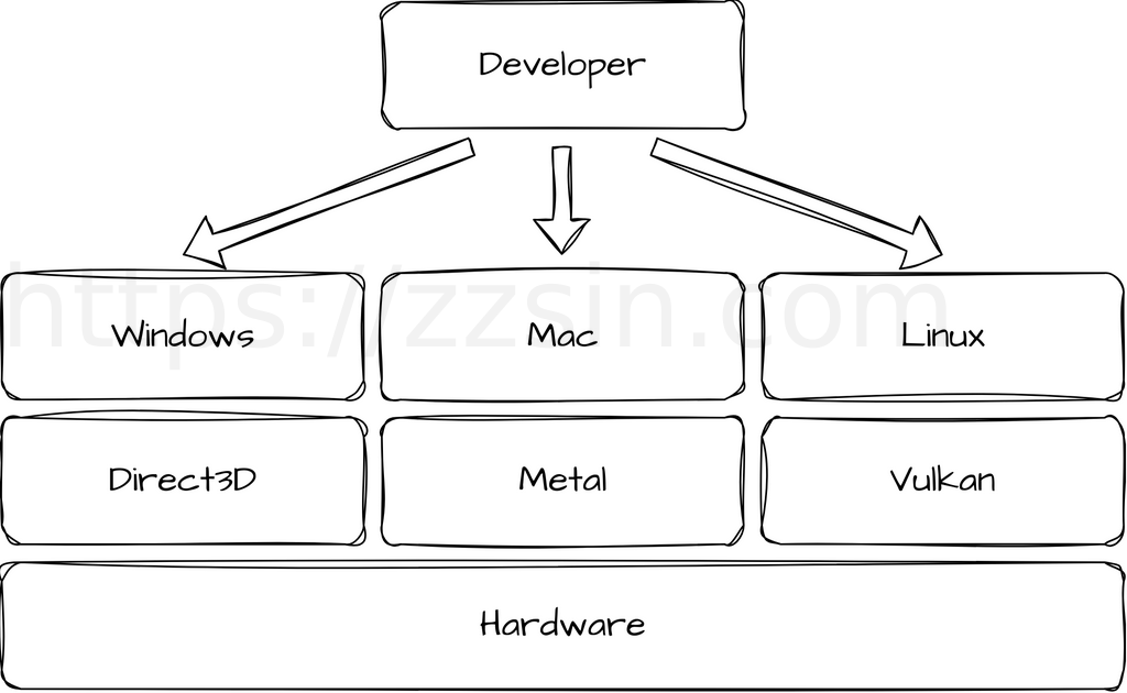 在 Windows 上面,你就需要去调用 Direct3D(或者 Vulkan),在 Mac 上,你就需要调用 Metal,在 Linux 上面,你就需要调用 Vulkan。 如果你开发的软件恰好是一个跨平台的软件,那么光是这一层,就够你受的了。